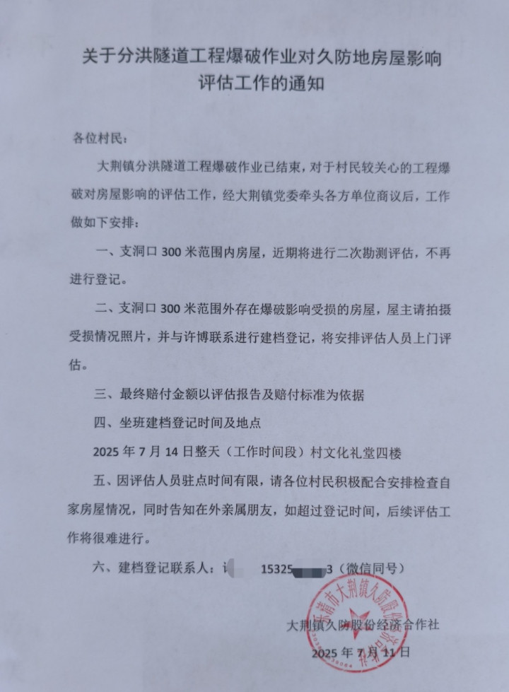 | 近日,浙江温州乐清市大荆镇久防村有关分洪隧道工程爆破作业引发房屋受损问题迎来新进展。继此前政府对支洞口300米范围内的部分受损房屋屋主发放生活补偿后,大荆镇久防股份经济合作社于2025年7月11日发布通知,启动房屋受损情况的登记与评估工作,将展开赔偿工作。